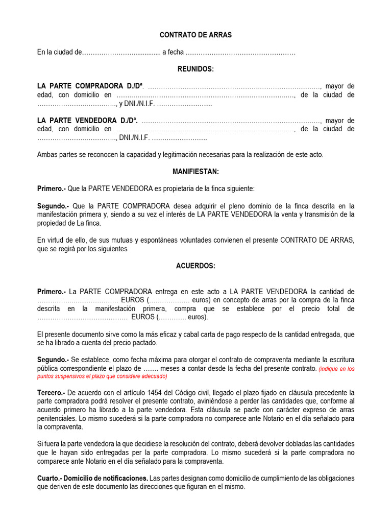 acuerdo primero ha librado a la parte vendedora. Esta cláusula se pacte con carácter expreso de arras