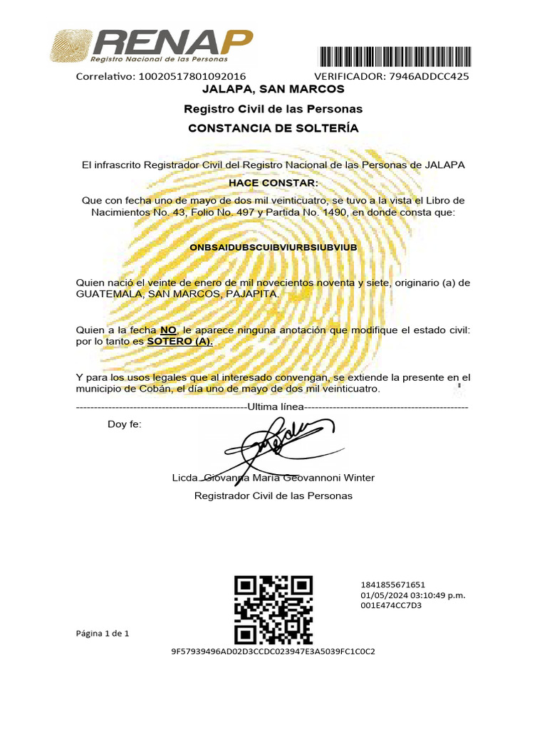El infrascrito Registrador Civil del Registro Nacional de las Personas de JALAPA