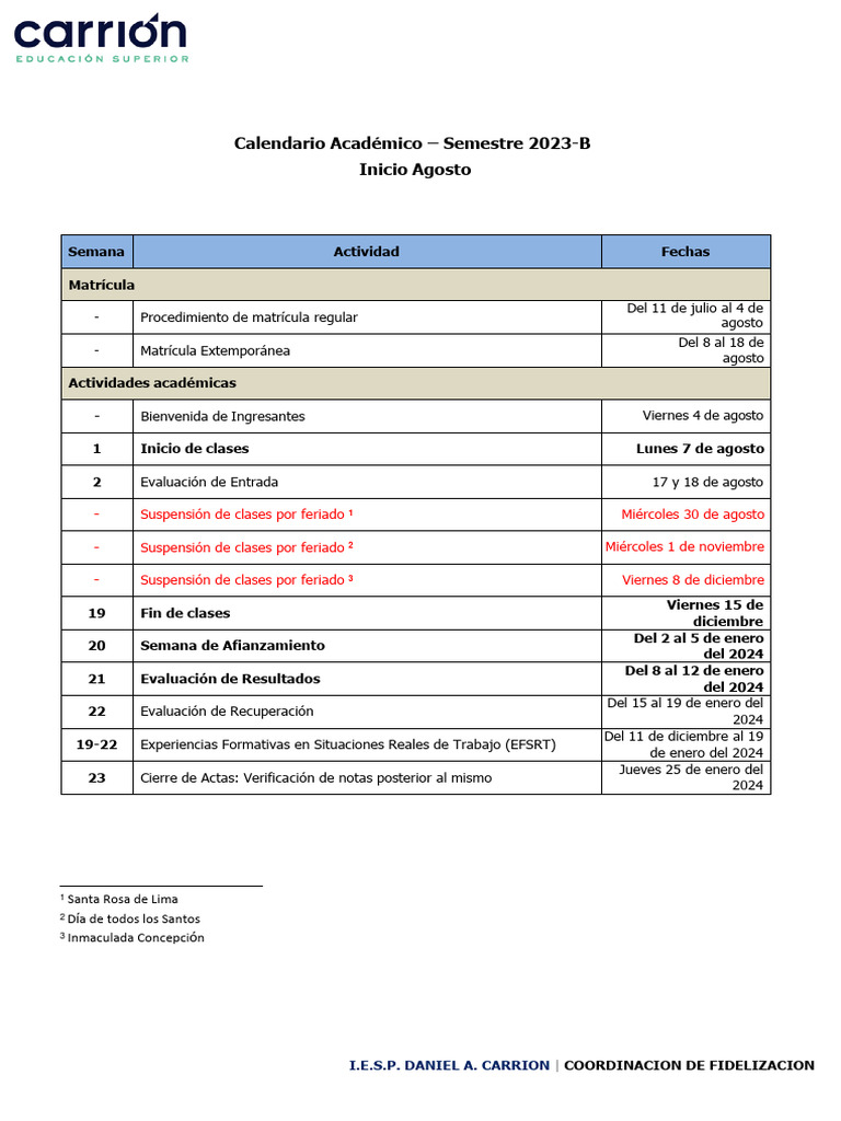 - Suspensión de clases por feriado 1 Miércoles 30 de agosto
