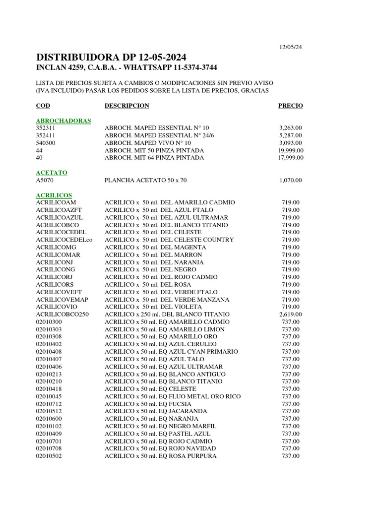 Lista de Precios de Suministros 2024