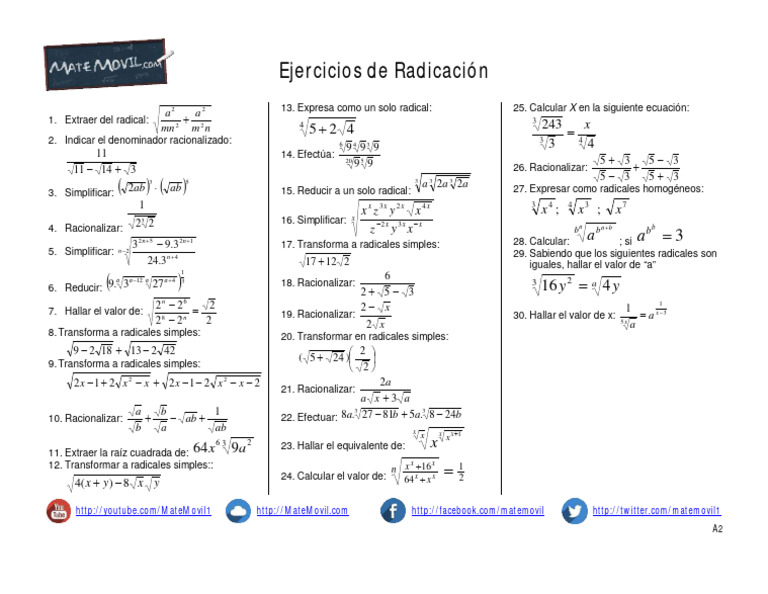 17. Transforma a radicales simples: 28. Calcular: