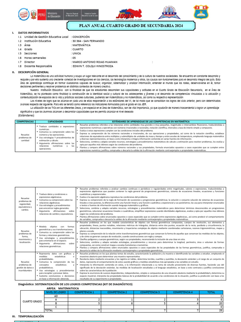 Nuestra Institución Educativa con la finalidad de que los estudiantes desarrollen sus capacidades y actitudes en el Cuarto Grado de Educación Secundaria, en el Área de