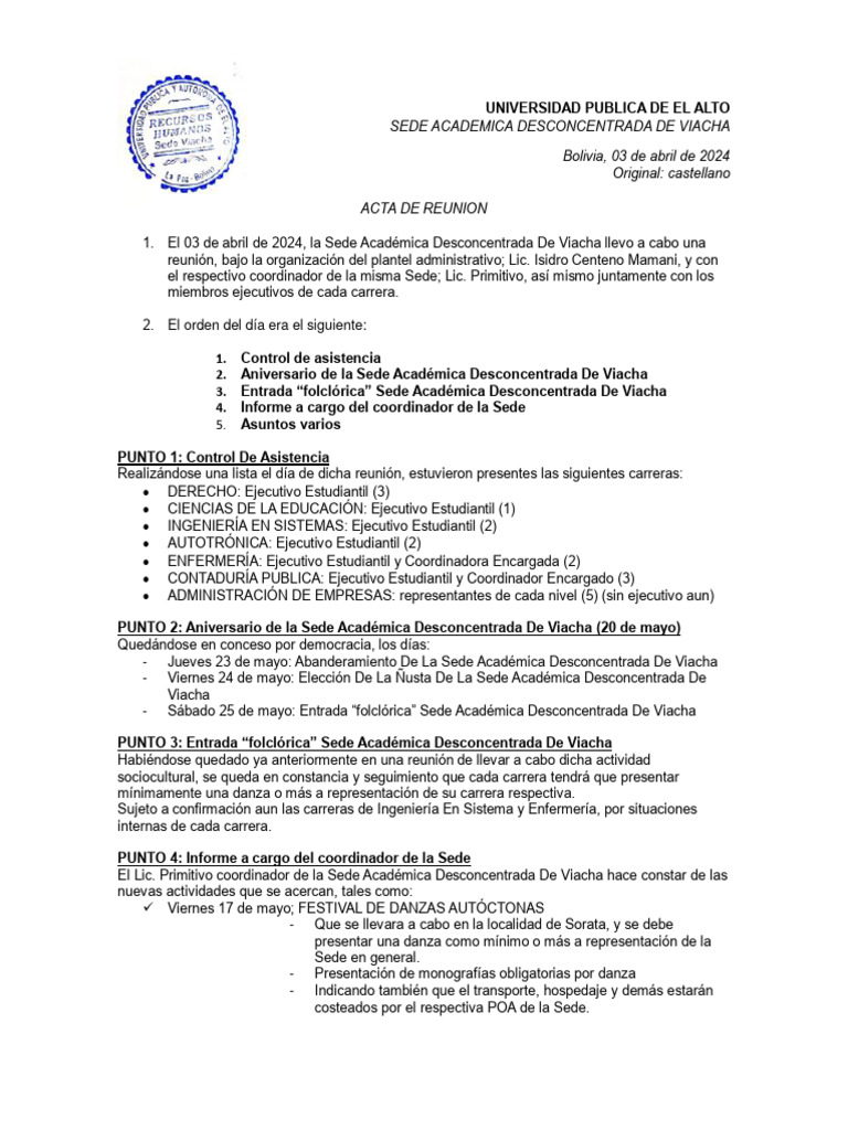1. El 03 de abril de 2024, la Sede Académica Desconcentrada De Viacha llevo a cabo una
