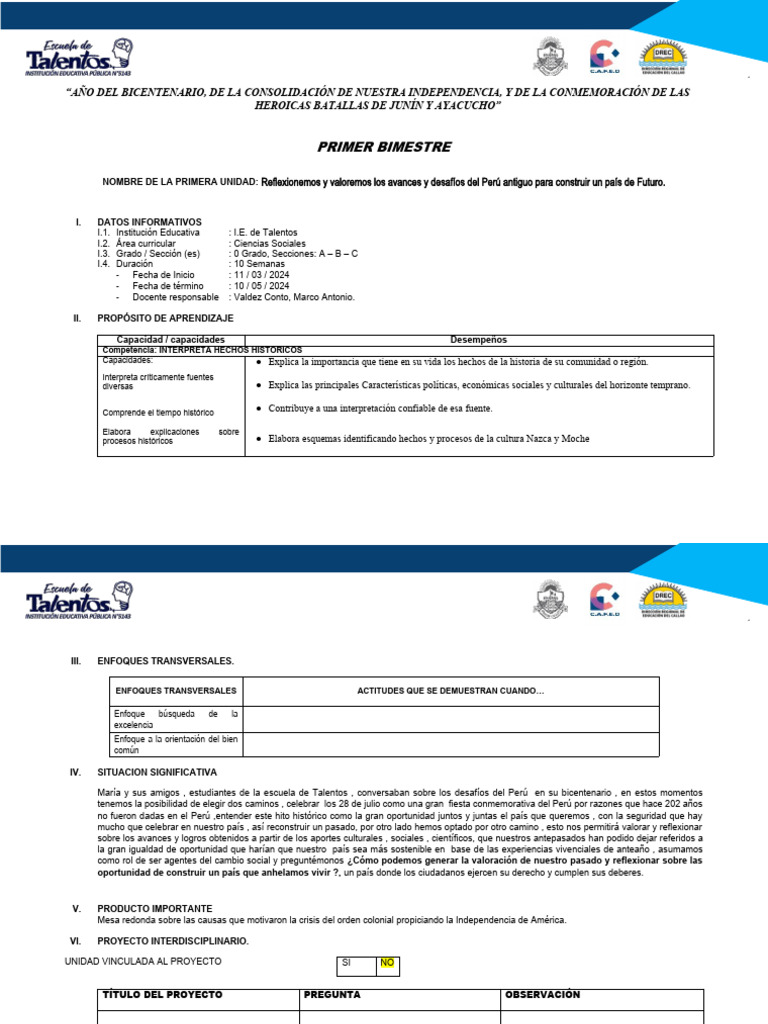 NOMBRE DE LA PRIMERA UNIDAD: Reflexionemos y valoremos los avances y desafíos del Perú antiguo para construir un país de Futuro.