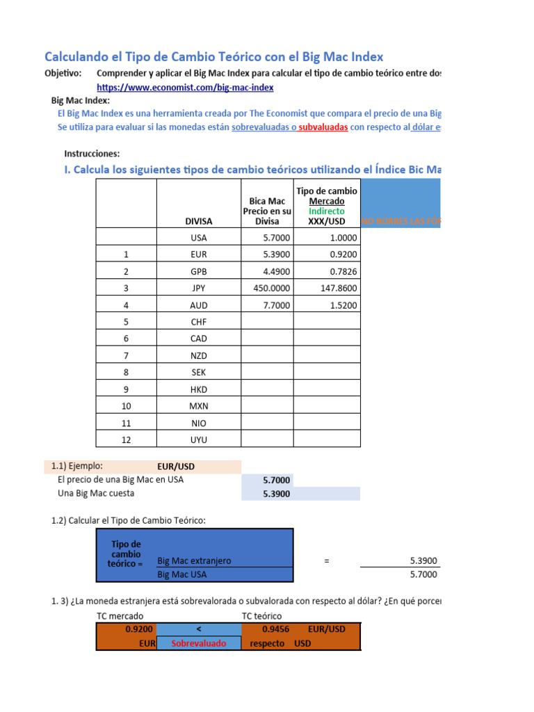 Objetivo: Comprender y aplicar el Big Mac Index para calcular el tipo de cambio teórico entre dos países.