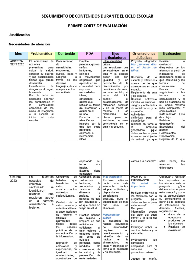 Mes Problemática Contenido PDA Ejes Orientaciones Evaluación