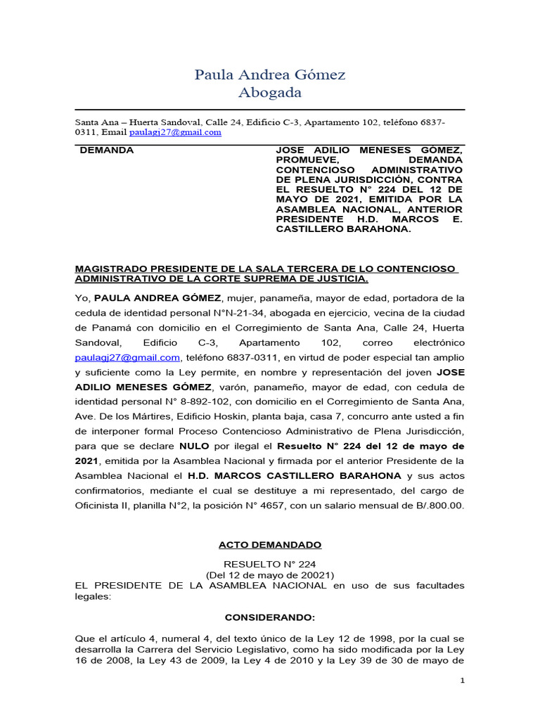 para que se declare NULO por ilegal el Resuelto N° 224 del 12 de mayo de