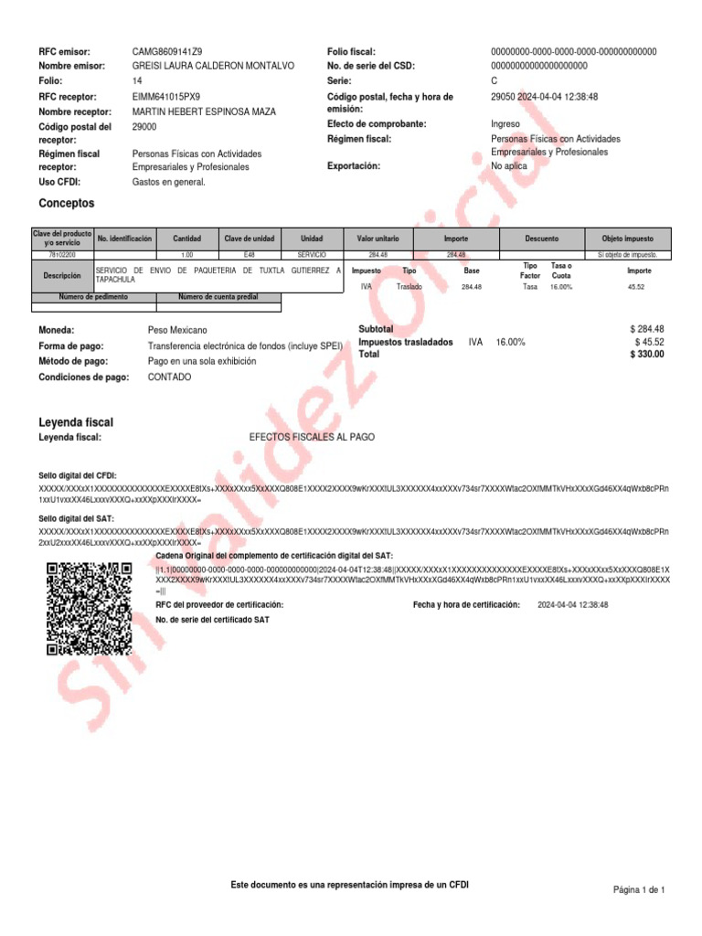 Nombre receptor: MARTIN HEBERT ESPINOSA MAZA emisión: