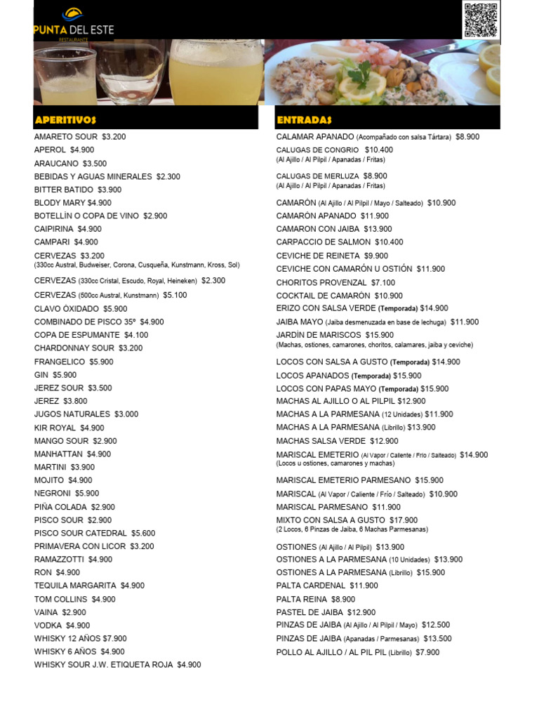 BLODY MARY $4.900 CAMARÓN (Al Ajillo / Al Pilpil / Mayo / Salteado) $10.900