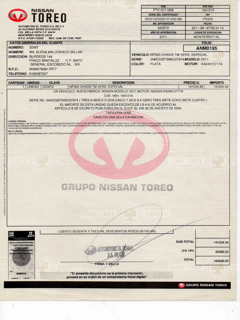 F R A C C SANTALUZ C P . 66072 SERIE: 3N6DD25T6BK037874MODEÍ.O; 2011