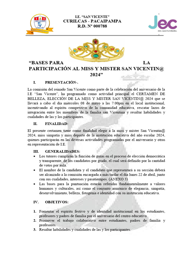 El presente certamen tiene como finalidad elegir a la miss y míster San Vicentin@