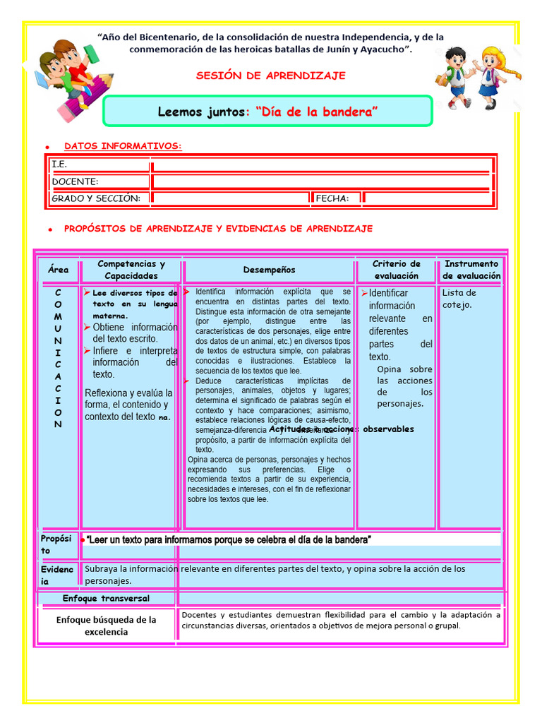 Propósi “Leer un texto para informarnos porque se celebra el día de la bandera”