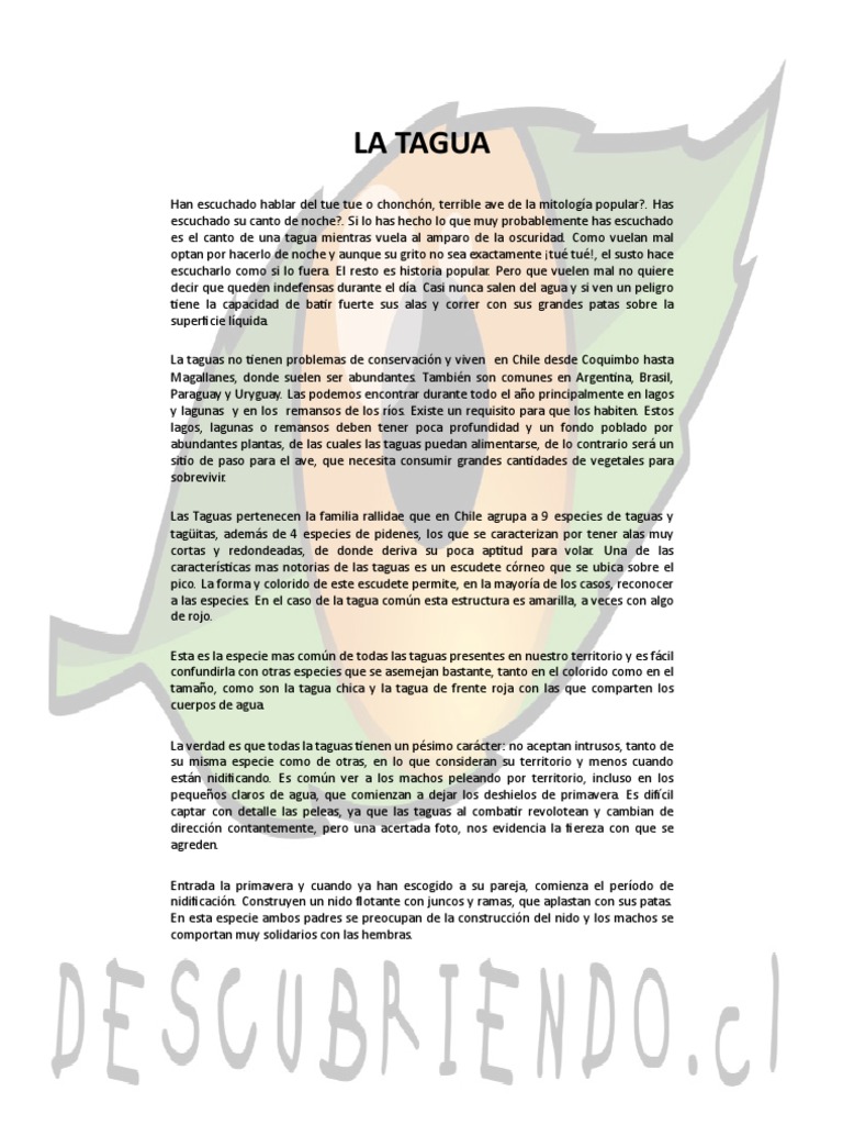 Hanescuchadohablardeltuetueochonchn,terribleavedelamitologapopular?.Has escuchadosucantodenoche?.Silohashecholoquemuyprobablementehasescuchado es el canto de una tagua mientras vuela al amparo de la oscuridad. Como vuelan mal optanporhacerlodenocheyaunquesugritonoseaexactamentetutu!,elsustohace escucharlocomosilofuera.Elrestoeshistoriapopular.Peroquevuelenmalnoquiere decirquequedenindefensasduranteelda.Casinuncasalendelaguaysivenunpeligro Eene la capacidad de baEr fuerte sus alas y correr con sus grandes patas sobre la supercielquida. LataguasnoEenenproblemasdeconservacinyviven enChiledesdeCoquimbohasta Magallanes, donde suelen ser abundantes. Tambin son comunes en ArgenEna, Brasil, ParaguayyUryguay.Laspodemosencontrardurantetodoelaoprincipalmenteenlagos ylagunas yenlos remansosdelosros.Existeunrequisitoparaqueloshabiten.Estos lagos, lagunas o remansos deben tener poca profundidad y un fondo poblado por abundantesplantas,delascualeslastaguaspuedanalimentarse,delocontrarioserun siEo de paso para el ave, que necesita consumir grandes canEdades de vegetales para sobrevivir. Las Taguas pertenecen la familia rallidae que en Chile agrupa a 9 especies de taguas y tagitas, adems de 4 especies de pidenes, los que se caracterizan por tener alas muy cortas y redondeadas, de donde deriva su poca apEtud para volar. Una de las caractersEcas mas notorias de las taguas es un escudete crneo que se ubica sobre el pico.Laformaycoloridodeesteescudetepermite,enlamayoradeloscasos,reconocer alasespecies.Enelcasodelataguacomnestaestructuraesamarilla,avecesconalgo derojo. Estaeslaespeciemascomndetodaslastaguaspresentesennuestroterritorioyesfcil confundirlaconotrasespeciesqueseasemejanbastante,tantoenelcoloridocomoenel tamao, como son la tagua chica y la tagua de frente roja con las que comparten los cuerposdeagua. LaverdadesquetodaslataguasEenenunpsimocarcter:noaceptanintrusos,tantode su misma especie como de otras, en lo que consideran su territorio y menos cuando estn nidicando. Es comn ver a los machos peleando por territorio, incluso en los pequeos claros de agua, que comienzan a dejar los deshielos de primavera. Es diVcil captar con detalle las peleas, ya que las taguas al combaEr revolotean y cambian de direccin contantemente, pero una acertada foto, nos evidencia la ereza con que se agreden. Entrada la primavera y cuando ya han escogido a su pareja, comienza el perodo de nidicacin.Construyenunnidootanteconjuncosyramas,queaplastanconsuspatas. Enestaespecieambospadressepreocupandelaconstruccindelnidoylosmachosse comportanmuysolidariosconlashembras.