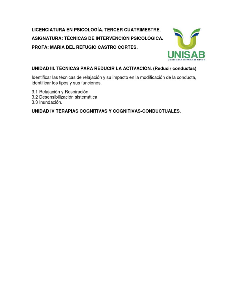 UNIDAD III. TÉCNICAS PARA REDUCIR LA ACTIVACIÓN. (Reducir conductas)