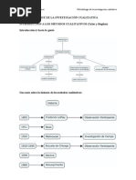 Etnometodologa la caracterstica distintiva de este mtodo radica en su inters por centrarse en el estudio de los mtodos o estrategias empleadas por las personas para construir, dar sentido y significado a sus prcticas sociales cotidianas (Pag, 50) Realizan estudios etnogrficos de las instituciones y procesos sociales sobre la asuncin de que las acciones de las personas solo pueden explicarse en referencia al contexto dentro del cual tuvieron lugar. Este tipo de estudios se interesa por cmo los individuos adquieren las perspectivas culturales de sus sociedades y las presenten en el curso de su vida diaria. (Pag, 50). Investigacin Accin Como la investigacin accin considera la situacin desde el punto de vista de los participantes, describir y explicar lo que sucede con el mismo lenguaje utilizado por ellos; o sea, con el lenguaje del sentido comn que la gente usa para describir y explicar las acciones humanas y las situaciones sociales en su vida cotidiana (Pag, 53) Como la investigacin accin contempla los problemas desde el punto de vista de quienes estn implicados en ellos, slo puede ser vlida a travs del dilogo libre de trabas con ellos (Pag, 53). Como objetivos que se pretenden con la investigacin participativa se destaca, por una parte, producir conocimiento y acciones tiles para un grupo de personas; por otra, que la gente se empodere/ capacite a travs del proceso de construccin y utilizacin de su propio conocimiento (Pag, 56).
