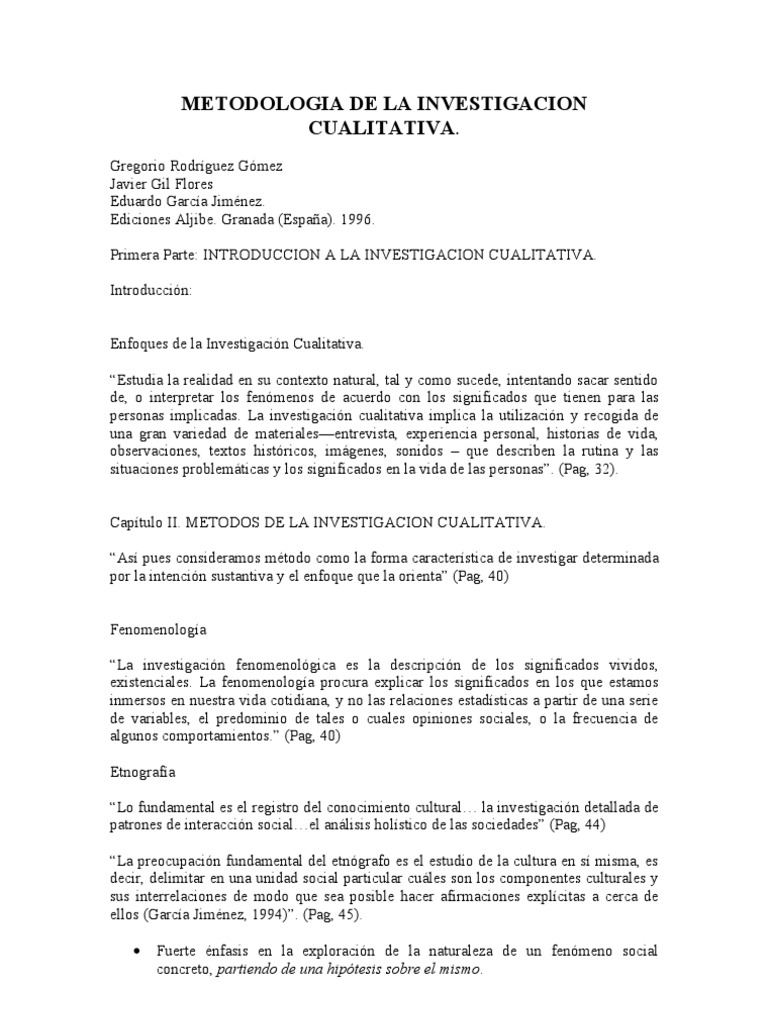 Gregorio Rodrguez Gmez Javier Gil Flores Eduardo Garca Jimnez. Ediciones Aljibe. Granada (Espaa). 1996. Primera Parte: INTRODUCCION A LA INVESTIGACION CUALITATIVA. Introduccin: Enfoques de la Investigacin Cualitativa. Estudia la realidad en su contexto natural, tal y como sucede, intentando sacar sentido de, o interpretar los fenmenos de acuerdo con los significados que tienen para las personas implicadas. La investigacin cualitativa implica la utilizacin y recogida de una gran variedad de materialesentrevista, experiencia personal, historias de vida, observaciones, textos histricos, imgenes, sonidos que describen la rutina y las situaciones problemticas y los significados en la vida de las personas. (Pag, 32). Captulo II. METODOS DE LA INVESTIGACION CUALITATIVA. As pues consideramos mtodo como la forma caracterstica de investigar determinada por la intencin sustantiva y el enfoque que la orienta (Pag, 40) Fenomenologa La investigacin fenomenolgica es la descripcin de los significados vividos, existenciales. La fenomenologa procura explicar los significados en los que estamos inmersos en nuestra vida cotidiana, y no las relaciones estadsticas a partir de una serie de variables, el predominio de tales o cuales opiniones sociales, o la frecuencia de algunos comportamientos. (Pag, 40) Etnografa Lo fundamental es el registro del conocimiento cultural la investigacin detallada de patrones de interaccin socialel anlisis holstico de las sociedades (Pag, 44) La preocupacin fundamental del etngrafo es el estudio de la cultura en s misma, es decir, delimitar en una unidad social particular cules son los componentes culturales y sus interrelaciones de modo que sea posible hacer afirmaciones explcitas a cerca de ellos (Garca Jimnez, 1994). (Pag, 45). Fuerte nfasis en la exploracin de la naturaleza de un fenmeno social concreto, partiendo de una hiptesis sobre el mismo.