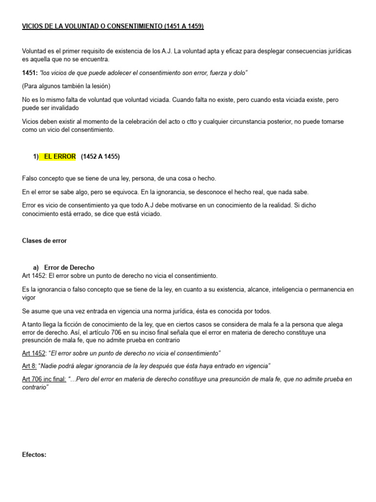 VICIOS DE LA VOLUNTAD O CONSENTIMIENTO (1451 A 1459)