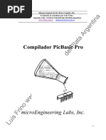 ensamblador para completar la tarea .Si todo funciona bien , se crea un archivo de cdigo microPIC (en este caso [Link]). Si existen errores , se emitir un listado de los mismos , que debern ser corregidos en su archivo fuente BASIC antes de ser compilados nuevamente. Para ayudarlo a asegurarse que su archivo original funcione sin errores , es mejor comenzar escribiendo y probando pequeas partes de su programa y no escribir 100000 lneas de programa y luego tratar de depurarlas de principio a fin. Si Ud, no le indica otra cosa , el PBP ,por defecto , crea cdigo para el PIC16F84 . Para compilar cdigos para otros micros PIC , simplemente use la opcin -p en la lnea de comandos , como se describe mas adelante , para especificar otro tipo de procesador .Por ejemplo si intenta usar el programa [Link] en un PIC16C74 , compile usando el comando PBP - p16c74 blink INDICE