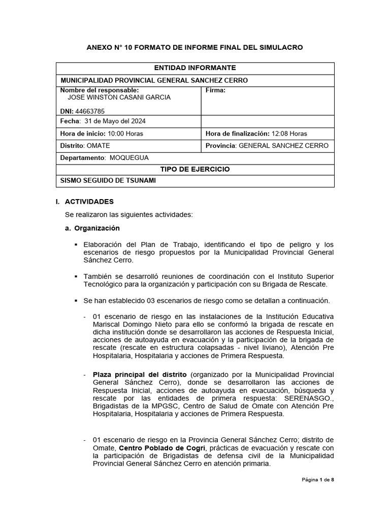 ANEXO N° 10 FORMATO DE INFORME FINAL DEL SIMULACRO