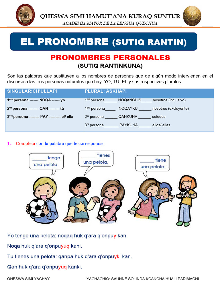 El tiene una pelota: paypa huk q’ara q’onpun kan.