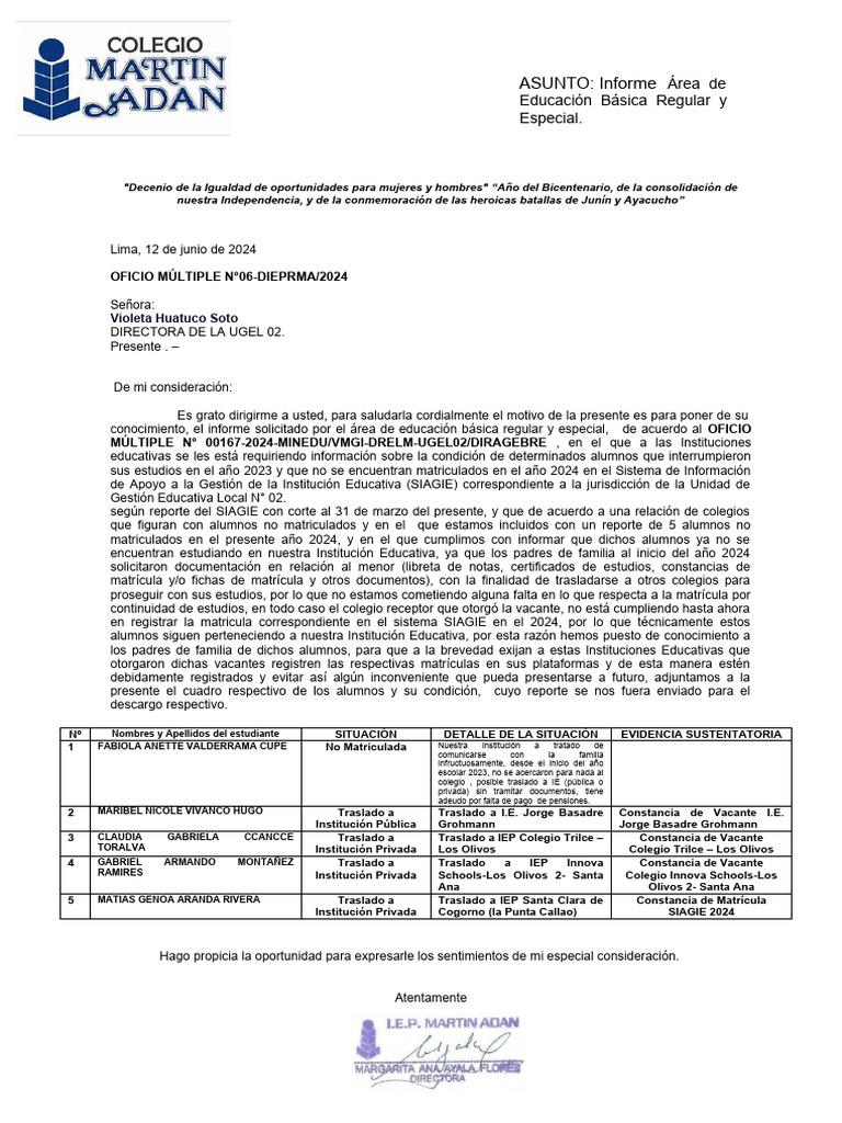 matriculados en el presente año 2024, y en el que cumplimos con informar que dichos alumnos ya no se