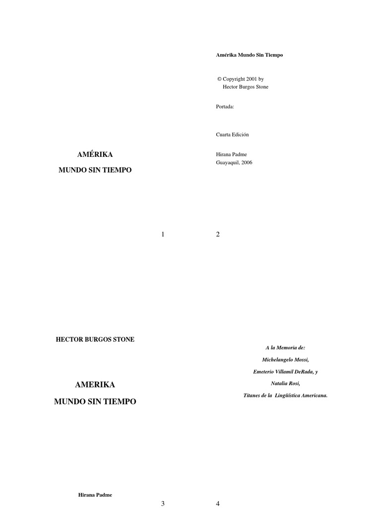 Se trata de nombres autctonos, anteriores a la invasin inglesa. Manus, el nombre del primer humano, es un topnimo de la zona de Saraguro, en Ecuador. Actualmente los nativos pronuncian Man. Manab, provincia en la costa de Ecuador, es el mismo nombre Manav. Los invasores lo transcribieron con b en lugar de v, fonemas cuya pronunciacin ha sido siempre ambigua en espaol. LAS CUATRO CREACIONES Segn las tradiciones Shuar, de Amrika, hubo cuatro creaciones del hombre, en dades distintas. La primera de ellas tuvo como base algunas secciones del genoma de la especie Panki, la anaconda de ro, una serpiente de gran tamao. La segunda se origin de la especie Chuanka, el gaviln. La tercera tuvo como base gentica al Pam o tapir. Y la cuarta constituy un proceso de clonacin de sectores genticos de la especie Yaw, el jaguar o tigre americano. El tapir pertenece a la familia de los Tayassuidae, la cual integran tambin el jabal, el pecari y el cerdo comn. Al presente se efecta trasplantes de hgado de cerdo a pacientes humanos. Antes, en casos de falta de apsitos, se empleaba trozos de carne de cerdo para curar heridas. Algunas religiones prohiben la ingestin de carne de cerdo, debido a posibles influencias genticas negativas.