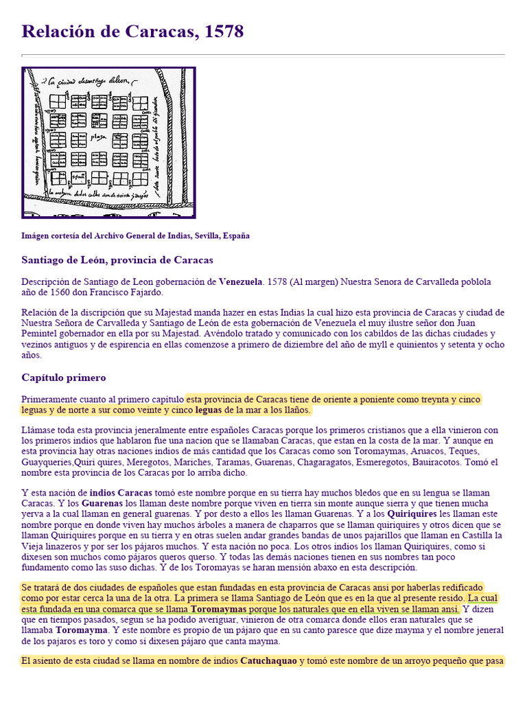 Y esta nación de indios Caracas tomó este nombre porque en su tierra hay muchos bledos que en su lengua se llaman