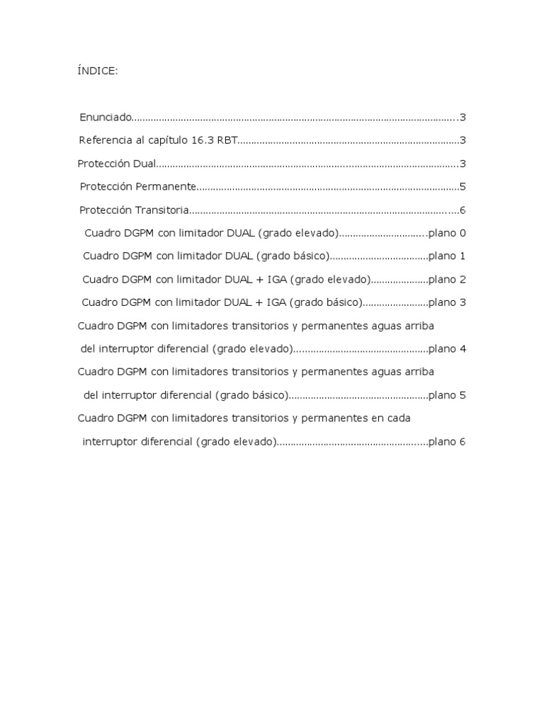 Enunciado..3 Referencia al captulo 16.3 RBT3 Proteccin Dual..3 Proteccin Permanente5 Proteccin Transitoria..6 Cuadro DGPM con limitador DUAL (grado elevado)..plano 0 Cuadro DGPM con limitador DUAL (grado bsico)plano 1 Cuadro DGPM con limitador DUAL + IGA (grado elevado)plano 2 Cuadro DGPM con limitador DUAL + IGA (grado bsico)plano 3 Cuadro DGPM con limitadores transitorios y permanentes aguas arriba del interruptor diferencial (grado elevado).plano 4 Cuadro DGPM con limitadores transitorios y permanentes aguas arriba del interruptor diferencial (grado bsico)plano 5 Cuadro DGPM con limitadores transitorios y permanentes en cada interruptor diferencial (grado elevado).plano 6