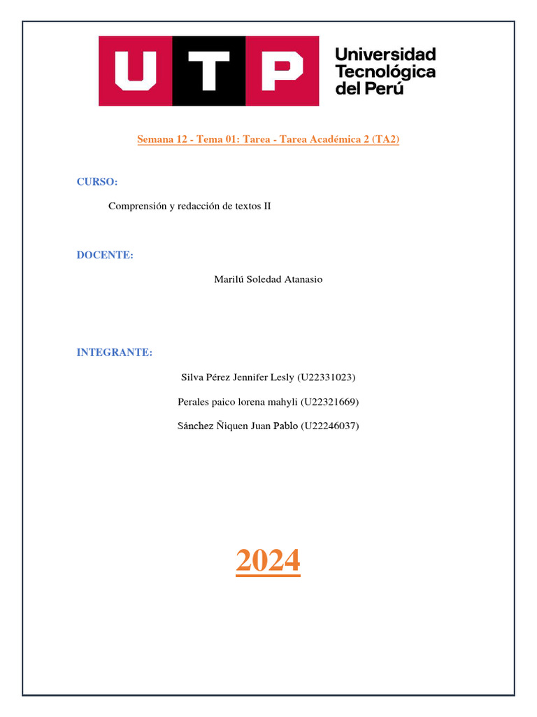 Semana 12 - Tema 01: Tarea - Tarea Académica 2 (TA2)