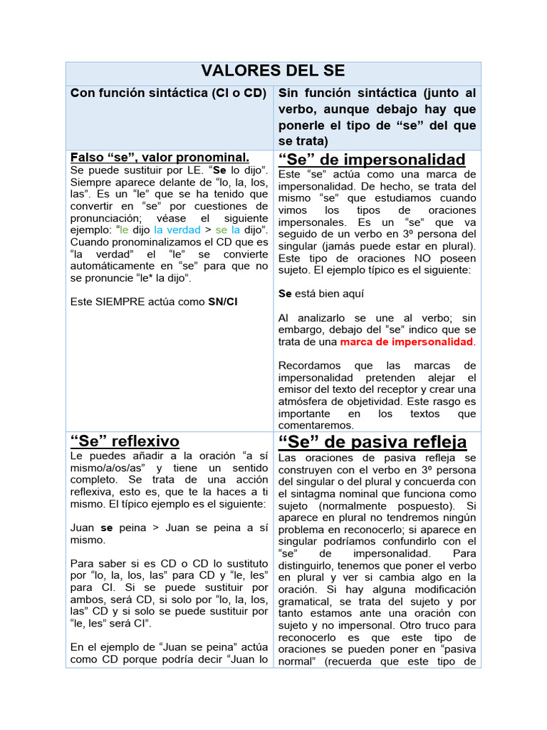 1. Señala el valor del “se” o cualquier otro pronombre átono en las