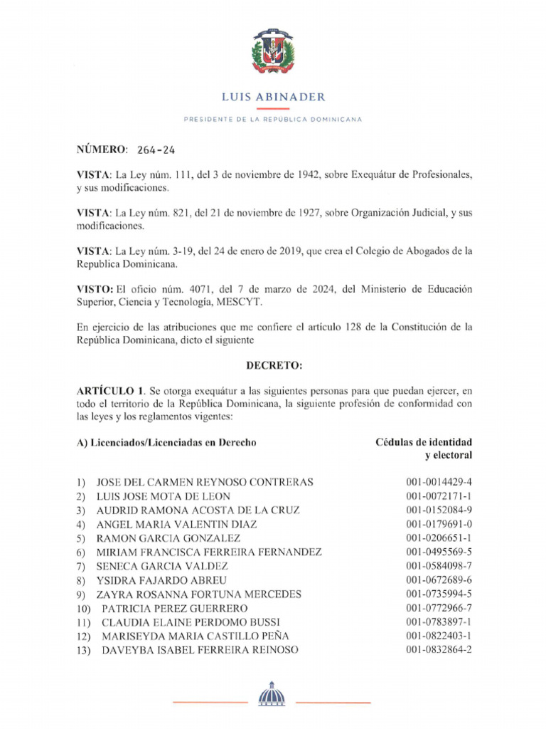 ARTÍCULO 1. Se otorga exequátur a las siguientes personas para que puedan ejercer, en