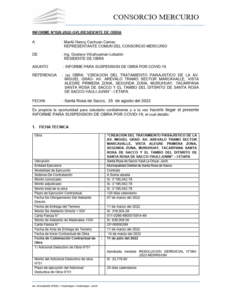 INFORME PARA SUSPENSION DE OBRA POR COVID-19, el cual detallo: