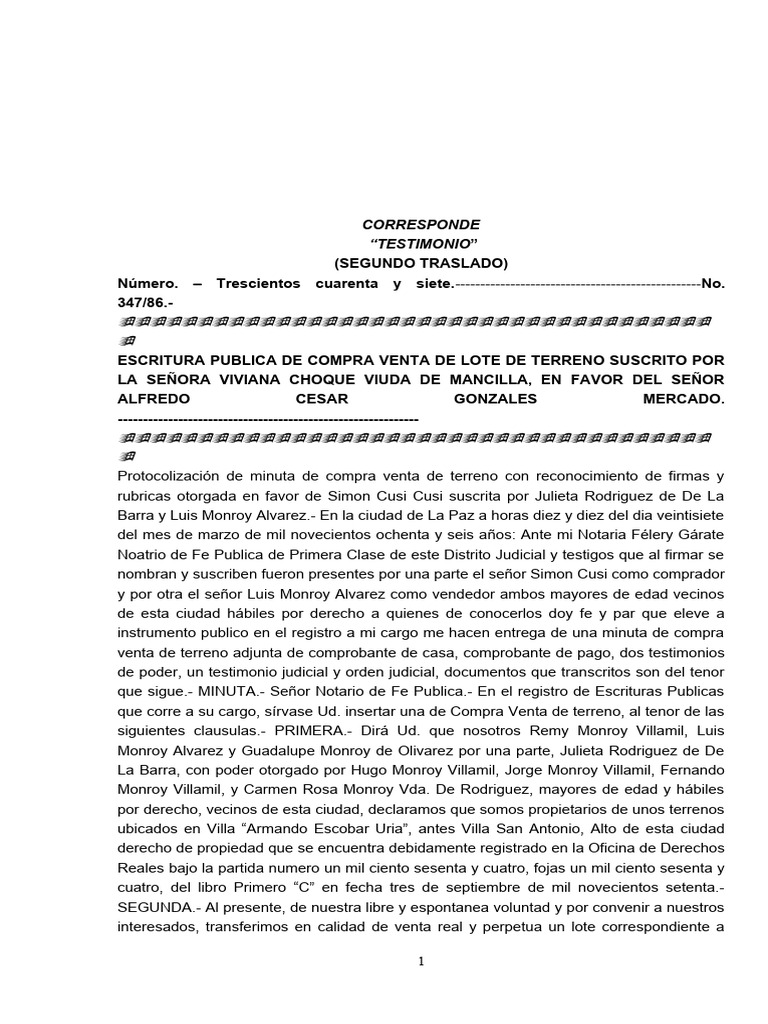 ESCRITURA PUBLICA DE COMPRA VENTA DE LOTE DE TERRENO SUSCRITO POR