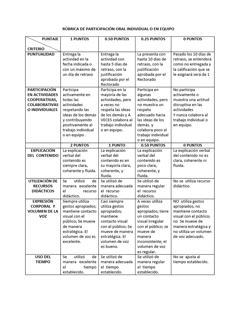 RÚBRICA DE PARTICIPACIÓN ORAL INDIVIDUAL O EN EQUIPO
