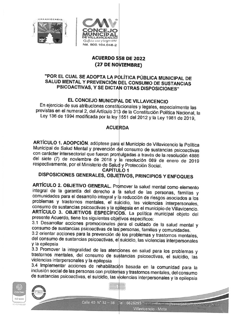 Municipal de Salud Mental y prevenci6n del consumo de sustancias psicoactivas