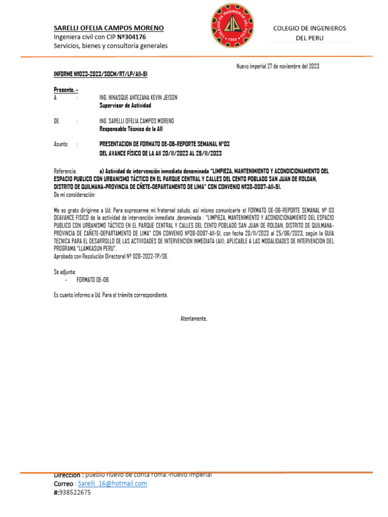 Me es grato dirigirme a Ud. Para expresarme mi fraternal saludo, así mismo comunicarle el FORMATO OE-06-REPORTE SEMANAL N° 03