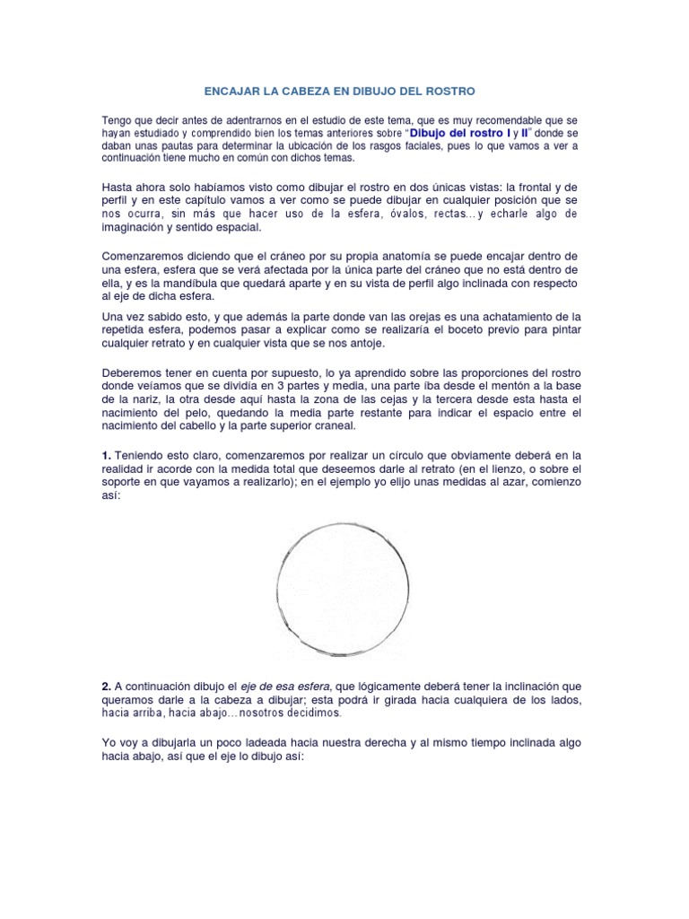Hasta ahora solo habamos visto como dibujar el rostro en dos nicas vistas: la frontal y de perfil y en este captulo vamos a ver como se puede dibujar en cualquier posicin que se nos ocurra, sin ms que hacer uso de la esfera, valos, rectasy echarle algo de imaginacin y sentido espacial. Comenzaremos diciendo que el crneo por su propia anatoma se puede encajar dentro de una esfera, esfera que se ver afectada por la nica parte del crneo que no est dentro de ella, y es la mandbula que quedar aparte y en su vista de perfil algo inclinada con respecto al eje de dicha esfera. Una vez sabido esto, y que adems la parte donde van las orejas es una achatamiento de la repetida esfera, podemos pasar a explicar como se realizara el boceto previo para pintar cualquier retrato y en cualquier vista que se nos antoje. Deberemos tener en cuenta por supuesto, lo ya aprendido sobre las proporciones del rostro donde veamos que se divida en 3 partes y media, una parte ba desde el mentn a la base de la nariz, la otra desde aqu hasta la zona de las cejas y la tercera desde esta hasta el nacimiento del pelo, quedando la media parte restante para indicar el espacio entre el nacimiento del cabello y la parte superior craneal. 1. Teniendo esto claro, comenzaremos por realizar un crculo que obviamente deber en la realidad ir acorde con la medida total que deseemos darle al retrato (en el lienzo, o sobre el soporte en que vayamos a realizarlo); en el ejemplo yo elijo unas medidas al azar, comienzo as: -