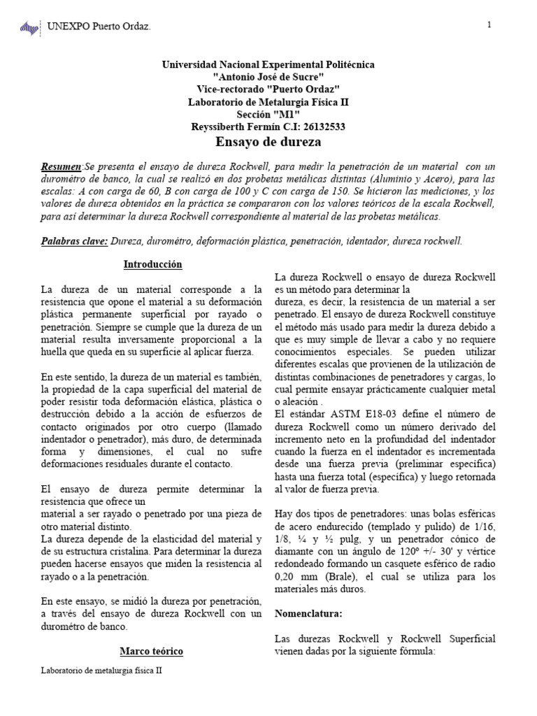 Palabras clave: Dureza, durométro, deformación plástica, penetración, identador, dureza rockwell.
