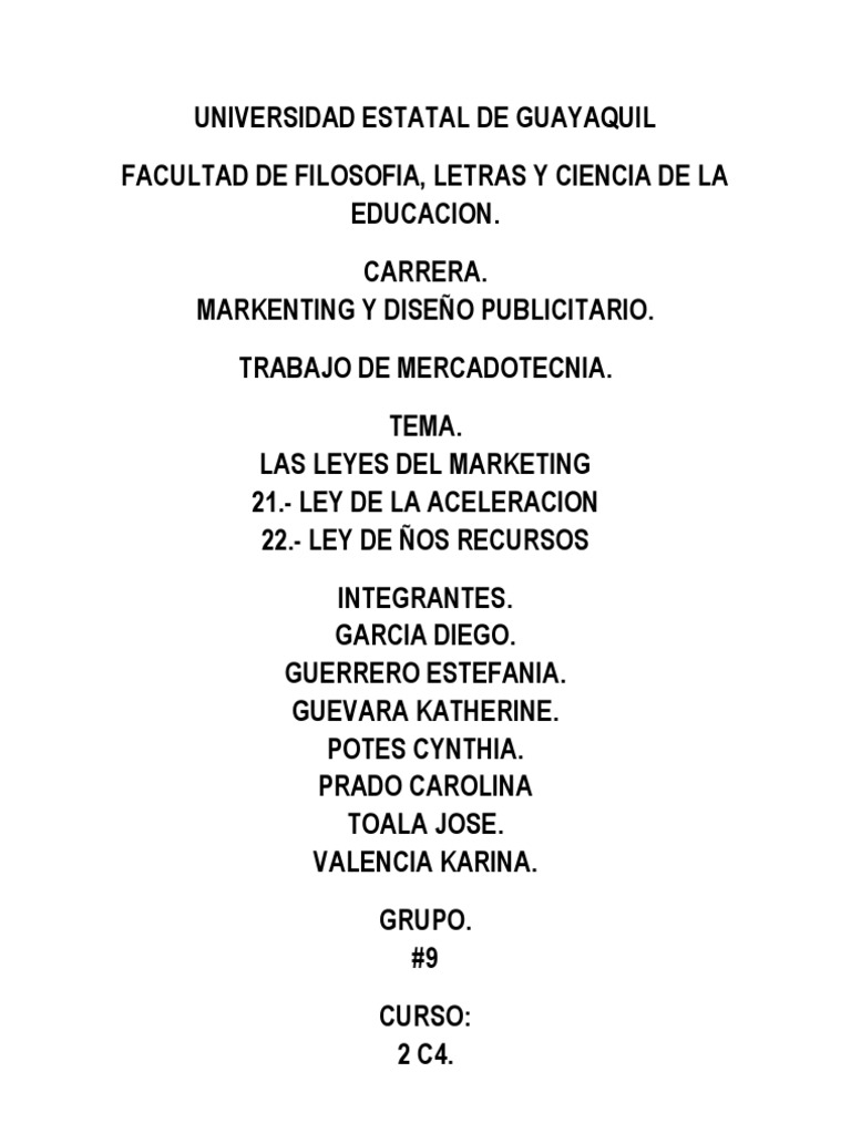 LAS LEYES DEL MARKETING 21.- LEY DE LA ACELERACION 22.- LEY DE OS RECURSOS INTEGRANTES. GARCIA DIEGO. GUERRERO ESTEFANIA. GUEVARA KATHERINE. POTES CYNTHIA. PRADO CAROLINA TOALA JOSE. VALENCIA KARINA. GRUPO. #9 CURSO: 2 C4.