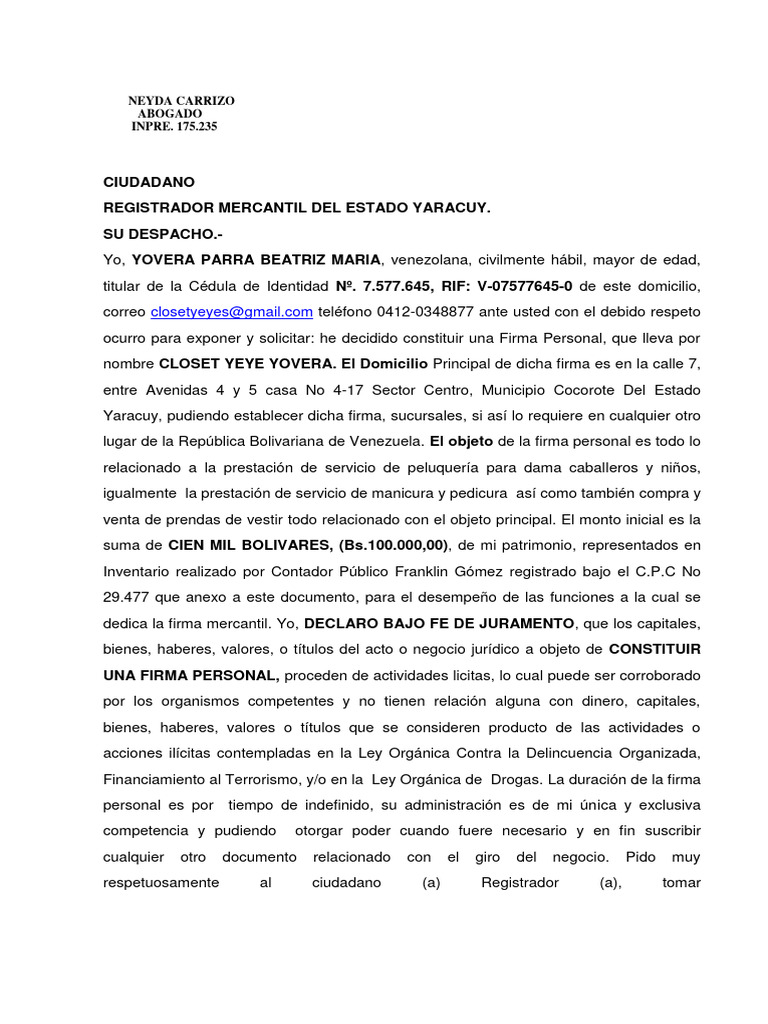 ocurro para exponer y solicitar: he decidido constituir una Firma Personal, que lleva por