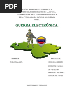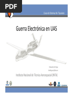 Guerra Electrnica El siguiente mdulo se ocupa de cada uno de los componentes, examina algunos temas relacionados, incluyendo conceptos de empleo de medidas de autoproteccin, apoyo y el uso potencial de vehculos de control remoto en la guerra electrnica. El empleo eficaz y oportuno de los principios bsicos tcticos y estratgicos, y la combinacin de las diferentes tcnicas y procedimientos de los componentes de la guerra electrnica deteriora en forma significativa las capacidades de las redes y sensores de la defensa enemiga. La perturbacin Chaff y bengalas cuando son dirigidas contra el sistema de control de aviones y red de alarma, degradan la capacidad enemiga para detectar, identificar y seguir a los blancos. Cuando se introduce perturbacin en el sistema de comunicaciones tierra-tierra y tierra-aire se interrumpe el sistema de mando y control. Son muchos los factores que afectan a la eficacia de la perturbacin, tales como la atenuacin atmosfrica, dispersin troposfrica y otros fenmenos asociados con la humedad y temperatura. Entre los mtodos de perturbacin se pueden citar las perturbaciones de puntos, de barrido, de barrera, perturbacin por lbulo lateral, perturbadores modulados y perturbacin de confusin/decepcin. Para ayudar a la penetracin para confundir y degradar a las defensas de radar enemigas se han creado instrumentos de EA consumibles, tal como el Chaff, seuelos y bengalas. Los (EA) se pueden emplear para destruir o suprimir la actividad del radar enemigo, para contrarrestar la eficacia de los radares al negarles informacin o para realizar maniobras de evasin y prevencin. La defensa area emplea las medidas de (EP) para superar los efectos del (EA) de los aviones atacantes. La mayora de los mtodos de (EP) slo son eficaces contra una accin de (EA) concreta, y el empleo de la misma puede degradar la capacidad del radar, limitando su alcance o reduciendo su sensibilidad, lo que puede ser aprovechado por el avin atacante para alcanzar su objetivo. 32 GU-02/2/10