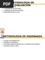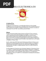 Guerra Electrnica a) Bsqueda y Deteccin Se realizan en aquella parte del EM en la que se sospecha que existen frecuencias utilizadas por el enemigo, ya sea en la operacin de radares como de sistemas de comunicaciones, navegacin, IFF o guiado de misiles. b) Localizacin y Seguimiento Por medio de radiogoniometra se establece la marcacin del punto de origen de una seal electromagntica detectada ya sea con sensores terrestres o mediante sensores a bordo de aeronaves; para lo cual, se tomarn varias marcaciones con diferentes intervalos de tiempo a fin de calcular la posicin del emisor mediante la triangulacin y/o mediante un algoritmo especializado. c) Anlisis Mediante el anlisis de la seal detectada se obtiene la informacin acerca de las caractersticas tcnicas de los dispositivos electrnicos del enemigo. La informacin obtenida proporcionar base para: 1) El establecimiento de las posibilidades de defensa del enemigo as como de sus intenciones ofensivas. 2) La correcta orientacin del programa de implementacin de los medios de EW propios. 3) La determinacin de las formas ms adecuadas y efectivas para lograr la anulacin y/o destruccin de los sistemas electrnicos del enemigo. d) Evaluacin La evaluacin se desprende del anlisis y se realiza para determinar en primer lugar la propia capacidad de ES/ELINT, lo cual puede dar lugar a reorientar el equipamiento con que se cuenta de acuerdo con los resultados. En segundo lugar, la evaluacin determinar la informacin para actualizar el EBO.