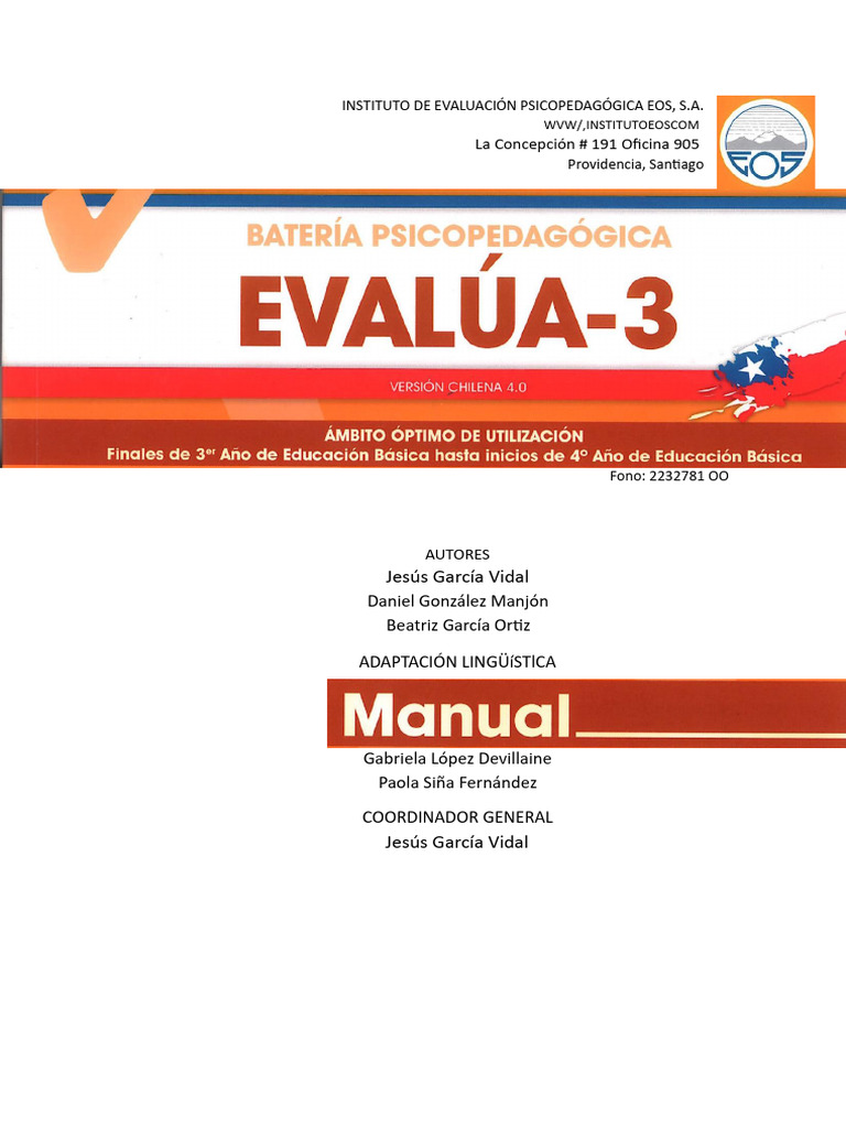 La balaría apl icada a los alumnos nornbro EVALÚA dc la Editorial EOS quo so ha ap!icado de forma grupal