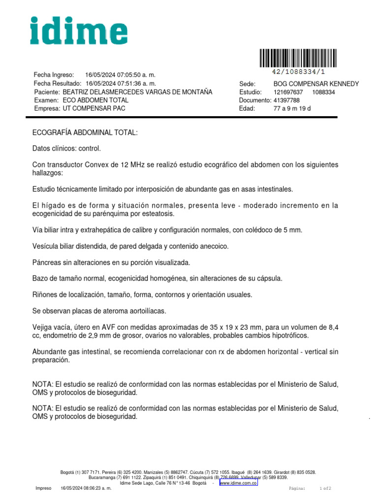 Paciente: BEATRIZ DELASMERCEDES VARGAS DE MONTAÑA Estudio: 121697637 1088334