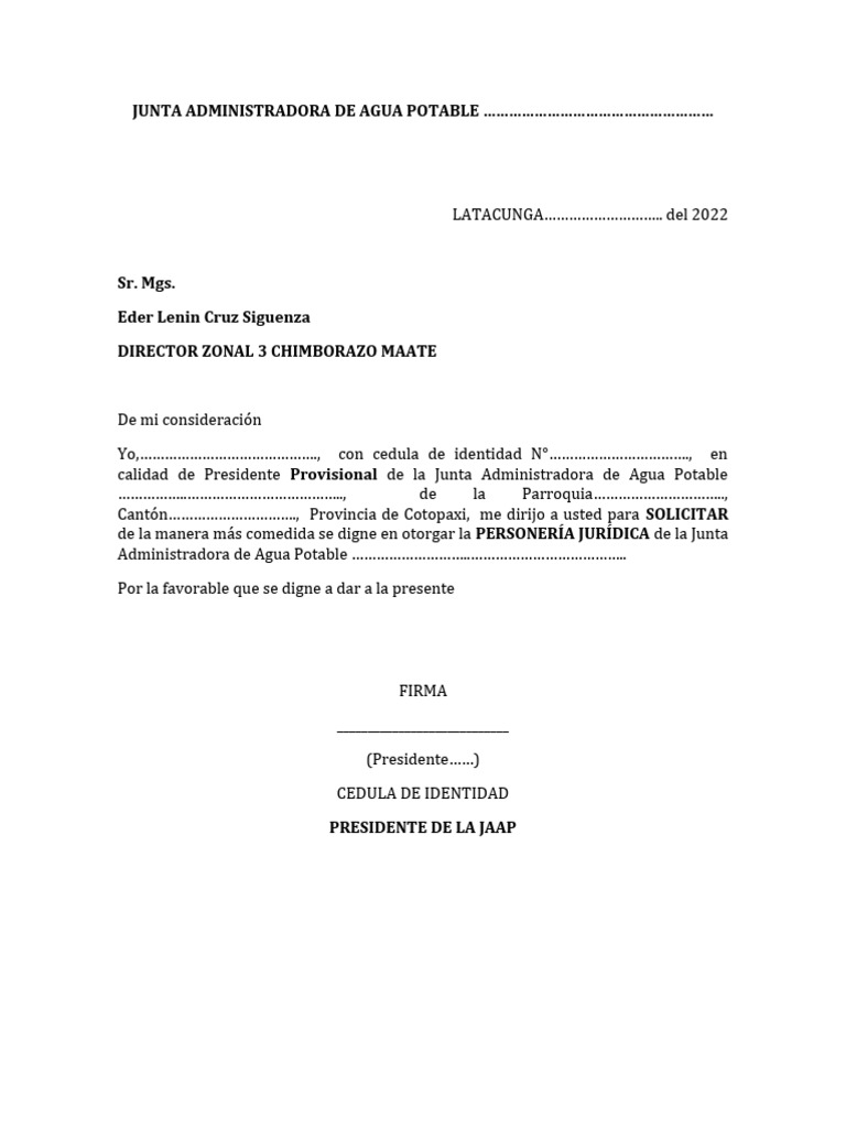 Cantó n…………………………., Provincia de Cotopaxi, me dirijo a usted para SOLICITAR