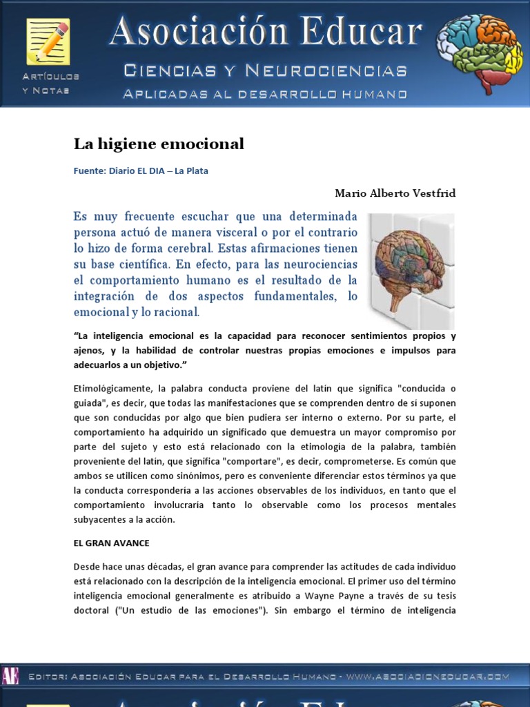 Es muy frecuente escuchar que una determinada persona actu de manera visceral o por el contrario lo hizo de forma cerebral. Estas afirmaciones tienen su base cientfica. En efecto, para las neurociencias el comportamiento humano es el resultado de la integracin de dos aspectos fundamentales, lo emocional y lo racional.