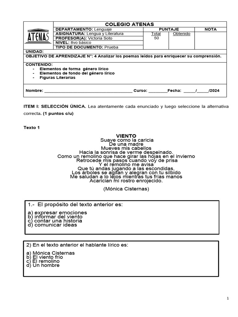 ÍTEM IV: Lee los siguientes poemas y completa los elementos que componen el género lírico