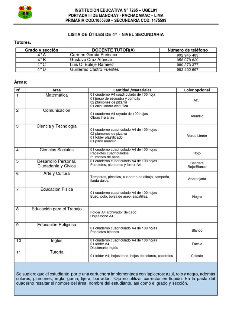 LISTA DE ÚTILES DE 4° - NIVEL SECUNDARIA