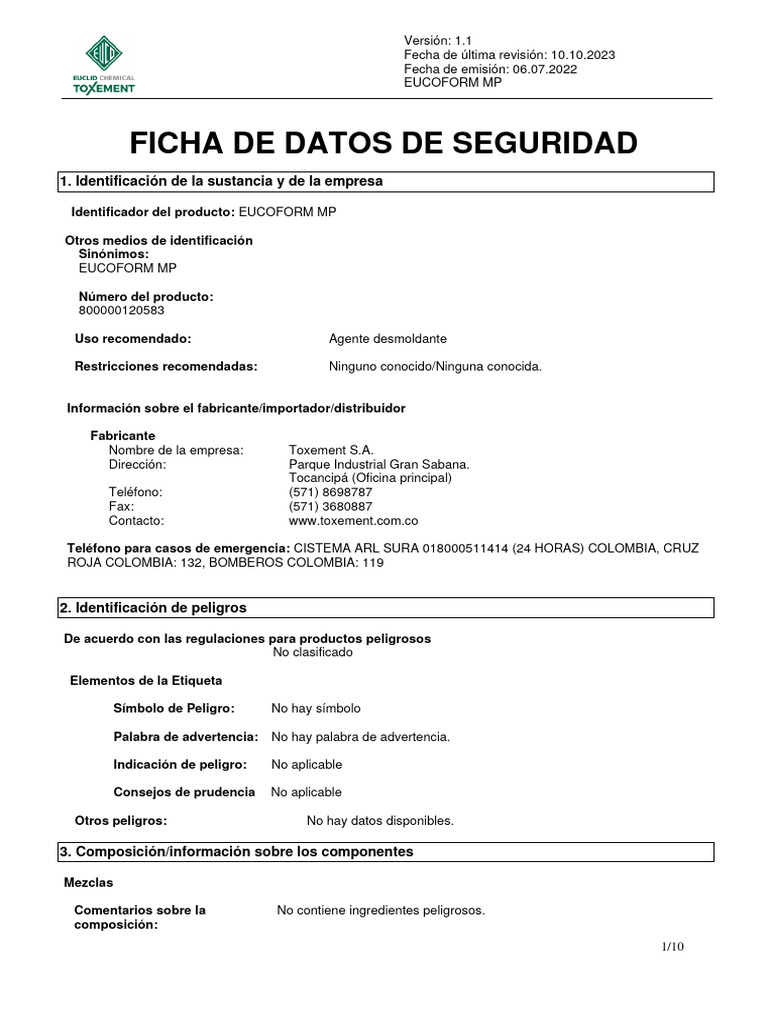 Teléfono para casos de emergencia: CISTEMA ARL SURA 018000511414 (24 HORAS) COLOMBIA, CRUZ