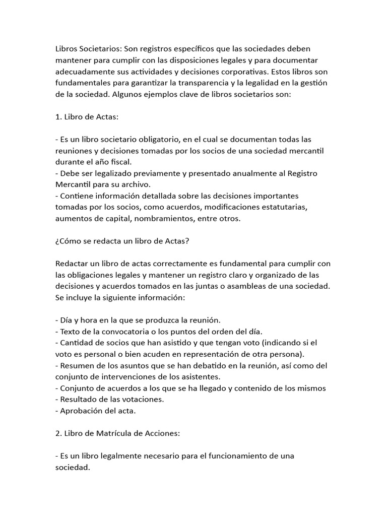 de la sociedad. Algunos ejemplos clave de libros societarios son: